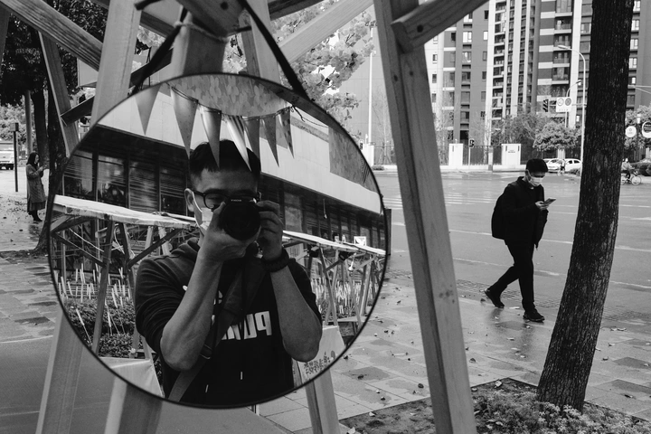 自拍有时间挺好玩,这里是一个夜市,摊子上经常有各种各样的镜子,我让自己出现在镜子里,然后等待一个行人经过右侧区域来平衡画面。