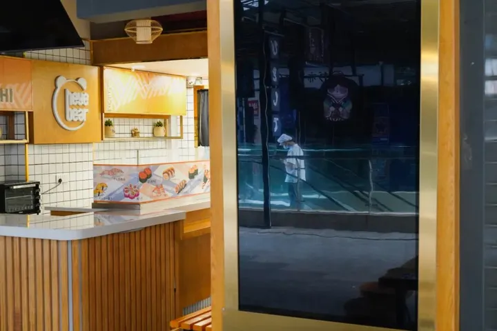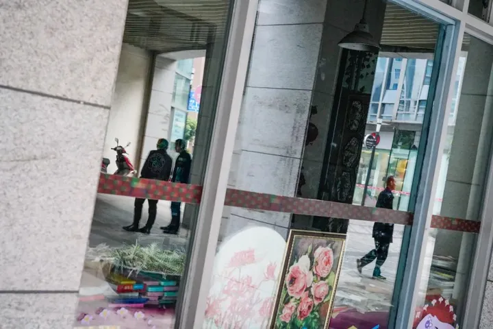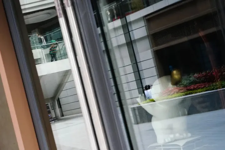 上电梯的小哥出现在了商店门口的玻璃反射中。