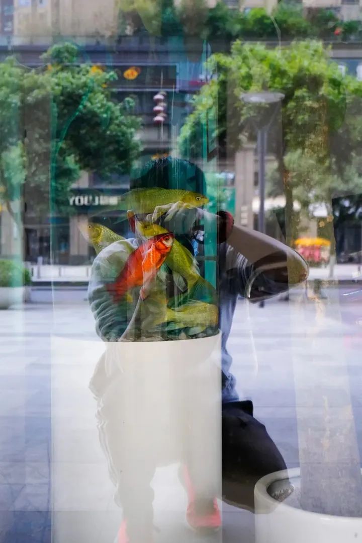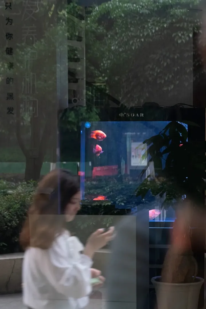 还是一个鱼缸,对焦到鱼之后等待有行人经过。