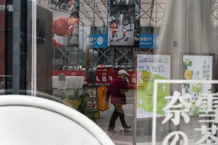 在奈雪奶茶店的玻璃上,反射出了背后的篮球活动宣传画,准备好相机之后等待行人经过。