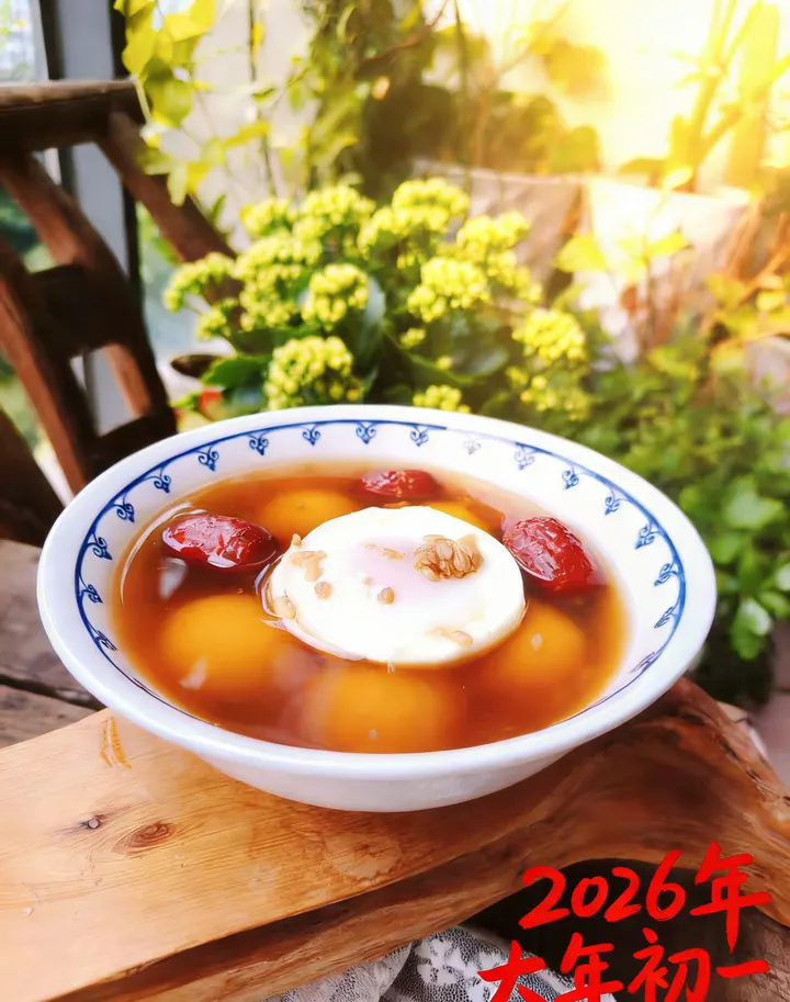 大年初一的第一缕晨光,落在两碗温热的甜汤里。 金黄的汤圆在红糖水中轻漾,饱满的红枣沉在碗底,一颗荷包蛋卧在中央,撒上的核桃碎与桂花,是藏在甜香里的细碎欢喜。 这一碗,是旧岁的余温,也是新年的序章。 汤圆裹着团圆的期许,红枣藏着红火的祝愿,每一口甜,都是对马年的温柔期许。 愿新的一年,日子如这碗甜汤,暖而不腻,甜而不烈; 愿我们在晨光里启程,在烟火里安住,马踏春风,万事胜意。