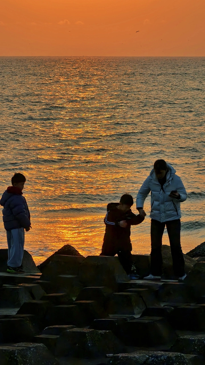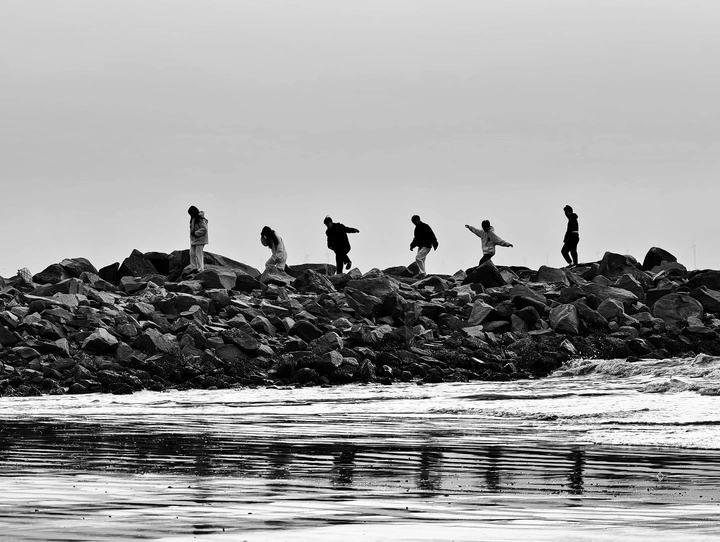 去海边拍日出,偶遇一帮年轻人,走在乱石堆上,抓拍时刚好排成一列。