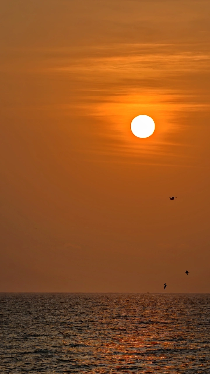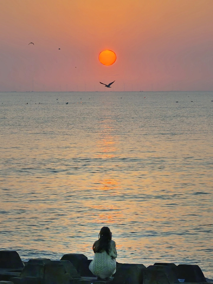 旭日东升,海鸟飞翔。