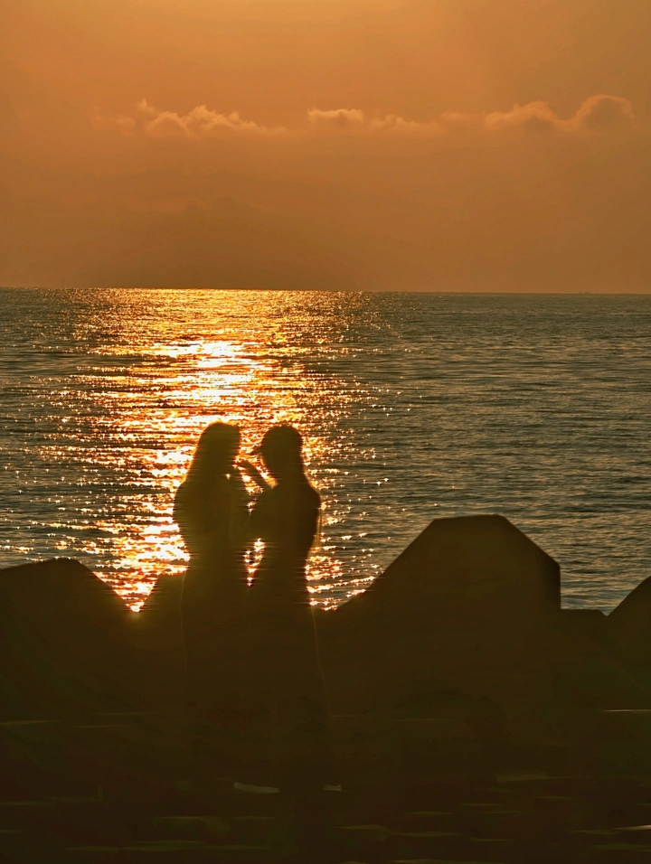 旭日东升,海边防波堤石上的两人。