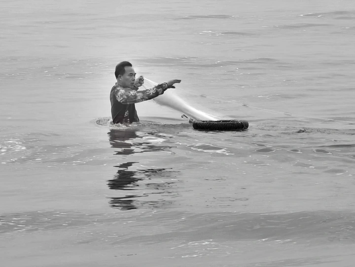 东海岸海边,一捕鱼者下水放网捕鱼。