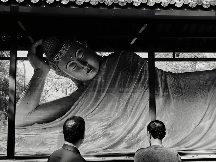 绛红的墙是沉默的山, 褐袍们伏成虔诚的浪, 而她和小小的她, 是浪尖上 一抹翠、一瓣黄。 孩子的鞋尖翘着, 像要把祈祷 系成蝴蝶的模样, 落在这庄重的褶皱里, 让信仰的重量, 也掺进 童真的轻。