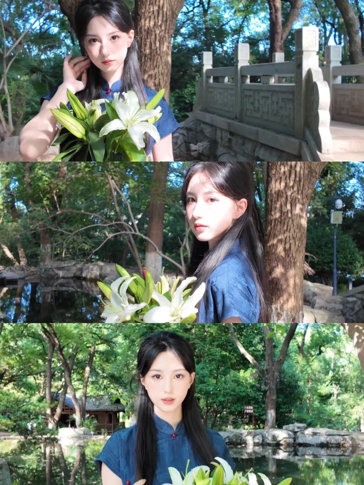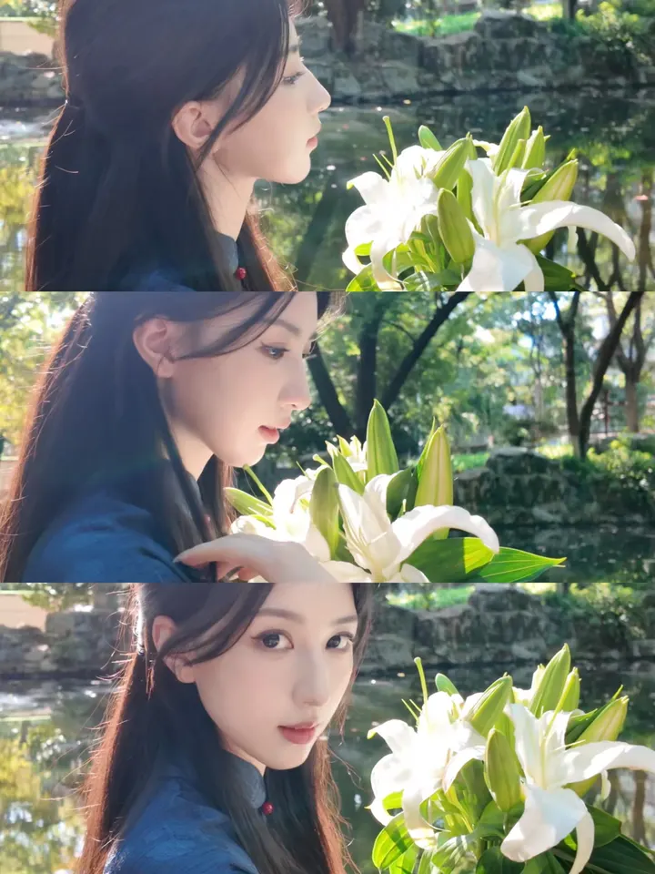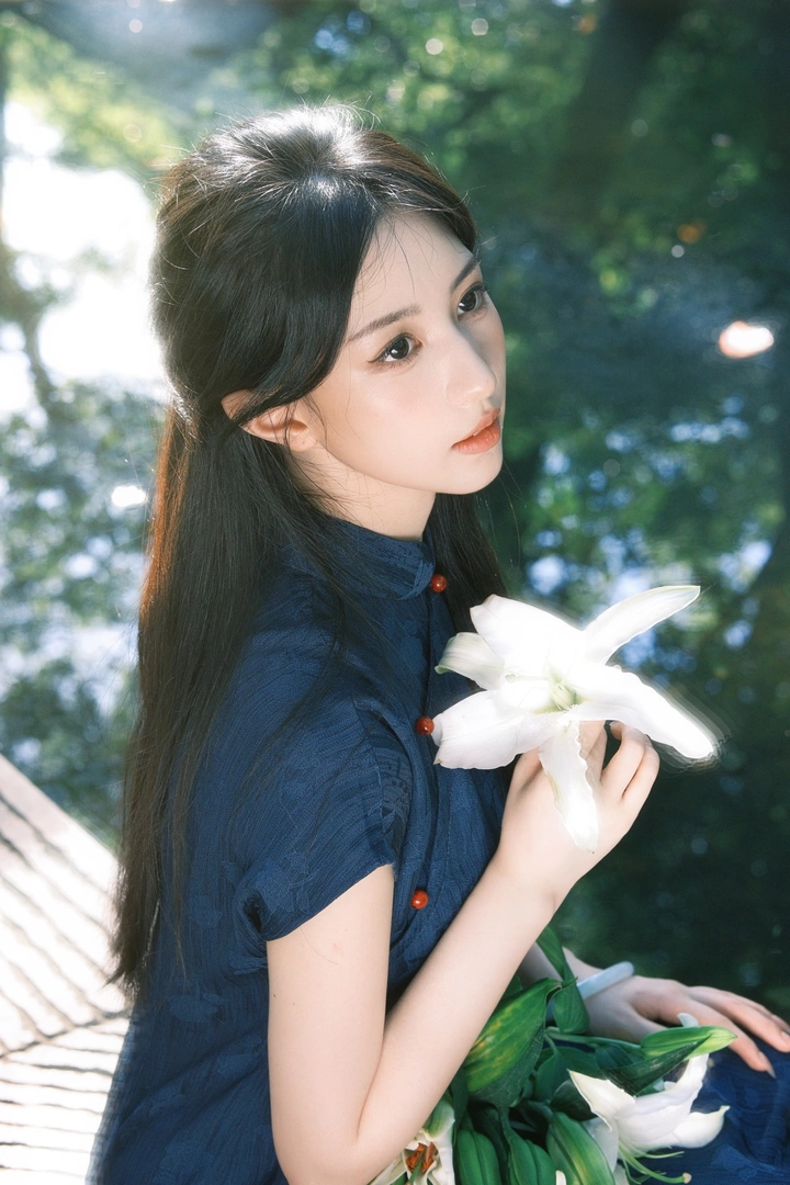 蓝裳半掩清颜瘦,百合盈怀岁月幽。