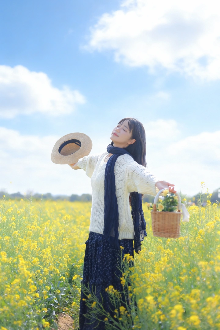 风掠过发梢,把春天的味道揉进呼吸里。 草帽、花篮,还有漫野的油菜花, 都在告诉我,这是属于松弛与自由的季节。