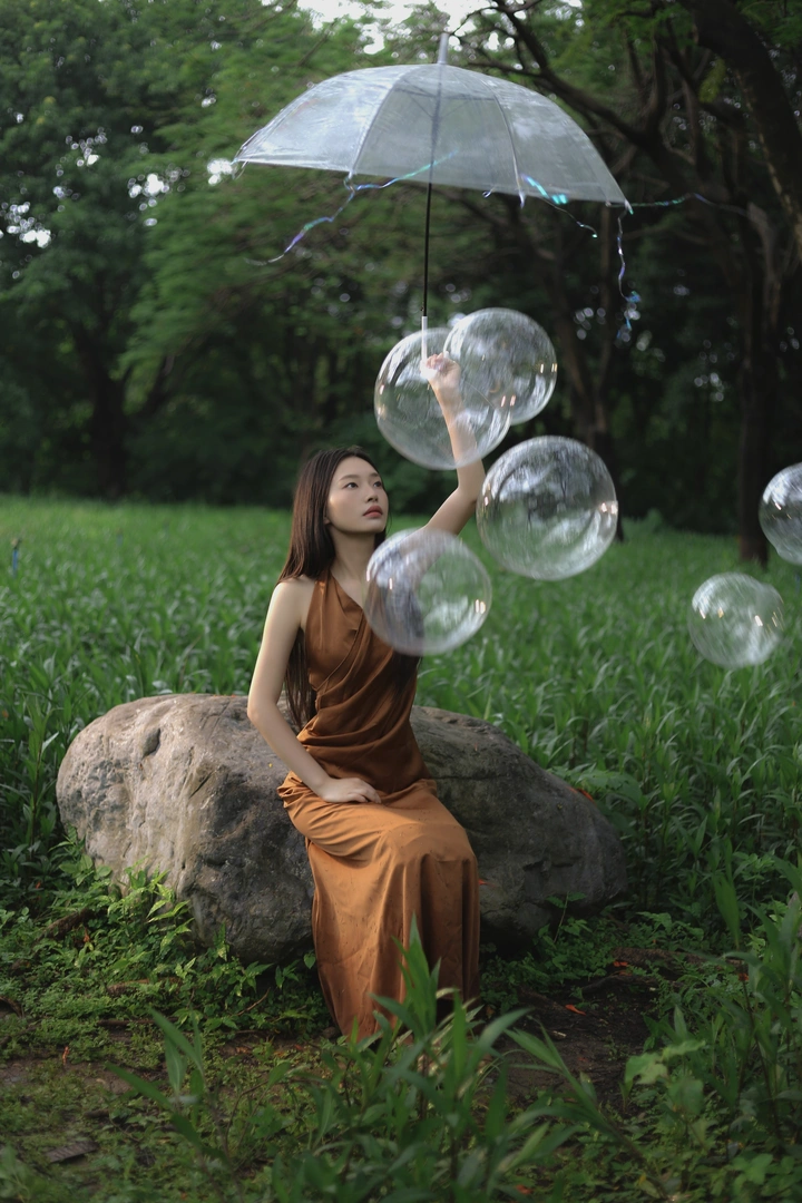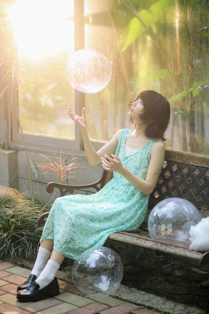 在满是绿意的温室里, 阳光是温柔的访客, 透明的泡泡载着细碎的光, 像一场不被打扰的白日梦, 轻轻落在裙摆与指尖。