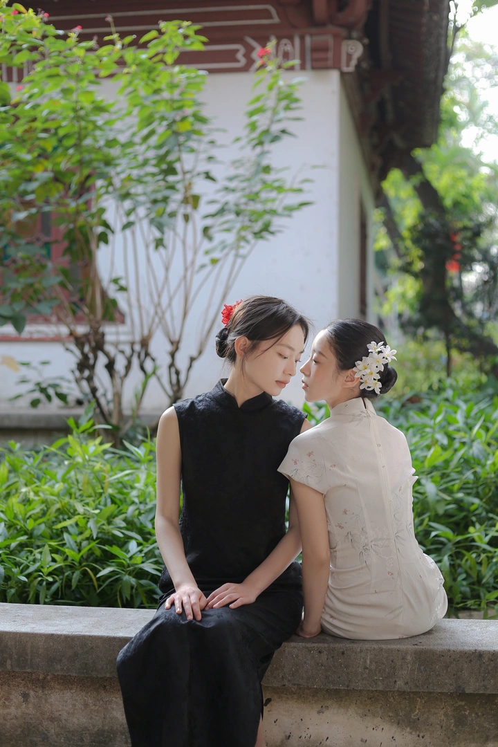 青石板桥,流水潺潺,一袭旗袍,风过林梢,吹动发间的红,也吹皱了一园春色,不必追赶时光,此刻便是最好的江南。