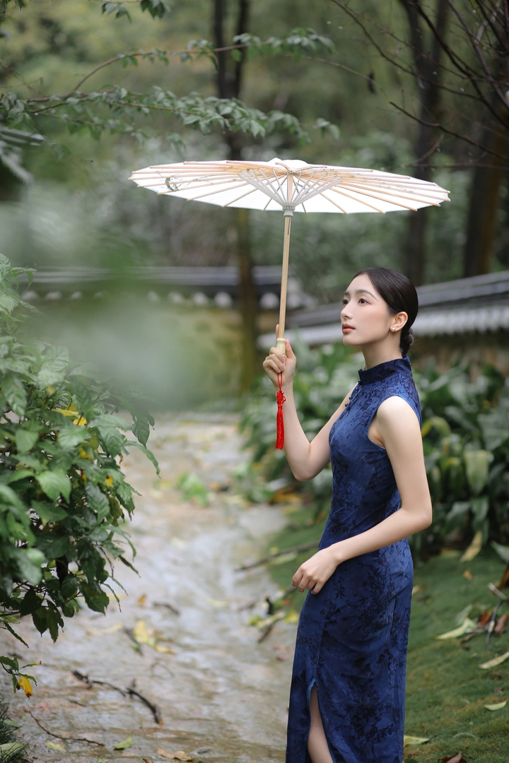 檐下听雨,旗袍温婉, 一伞一扇,一步一景, 东方韵味,尽在眉眼间。