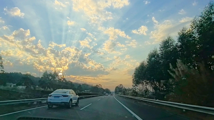 除夕的前一天(即2026.2.15.拍于广梧高速梧州至蕂县路段,华为手机拍摄,虽然挡风玻璃有点有点脏,但还能感受到当时美的晚霞场景。