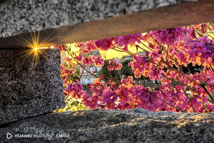 这张日常随外可见的花海照片,我利用了石头护栏作为框架将外面的景物放至框内,太阳西下刚好透过石蓬作画面的点逫点叠。