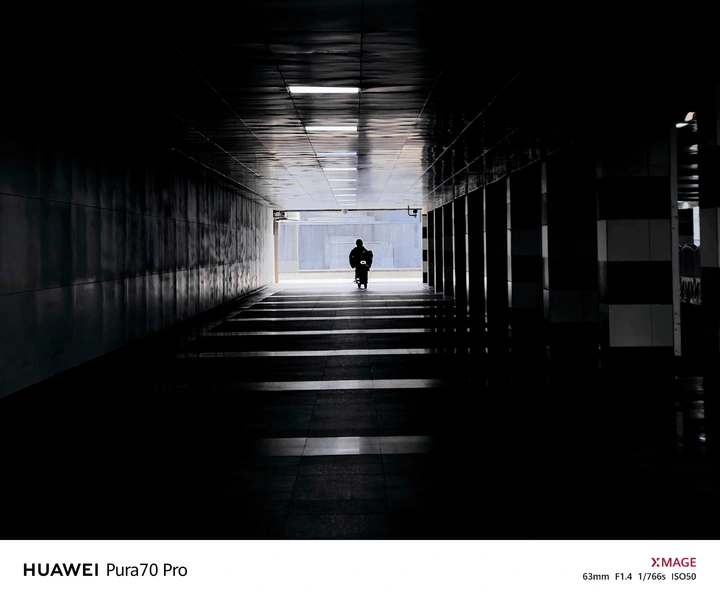 一个骑着电动车的路人正从手机的镜头里走,拍于东莞中心广场的一条地下道里。