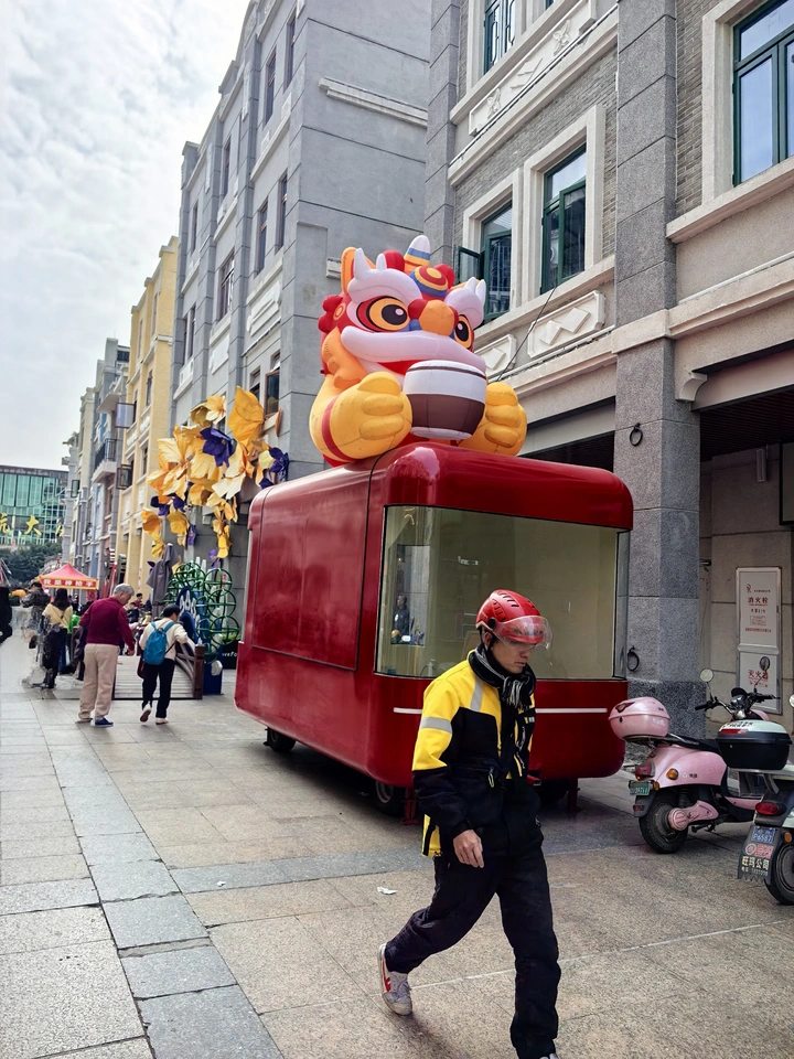 舞狮是一个传统文化,广西梧州骑楼街除热闹非常,与以往不同的是(今又增添了机器人这一项目)