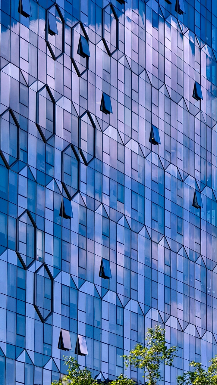建筑以玻璃为眼,将蓝天、白云、绿树悉数收纳。 镜面如灵动画布,云朵似肆意泼洒的白墨,蓝天作澄澈底色,绿树是鲜活点缀。 在这里,钢铁丛林与自然温柔相拥,每一块玻璃都是自然的相框,框住流动的诗意,让城市建筑不再冰冷,而是成为自然光影的容器,在反射间,重构都市与自然的美妙对话 。