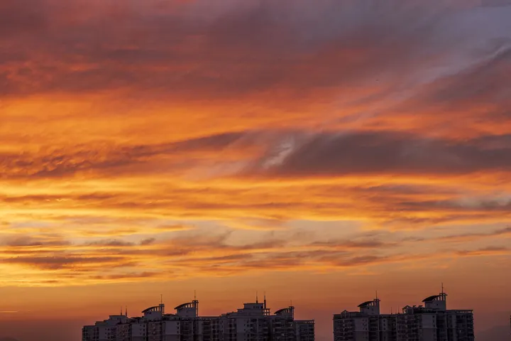 透过排列的窗孔,看夏日朝霞渐次铺展。最初,浅紫天空晕着薄云,像未醒的梦;接着,橙光漫入,给云朵描上金边,是黎明在试探。当炽热铺满孔洞,远山、楼宇都成了剪影,才惊觉,这不是单一的朝霞,是时光借小孔,把破晓的浪漫,一格格塞进眼里,每孔都是独属于清晨的、会流动的画 。