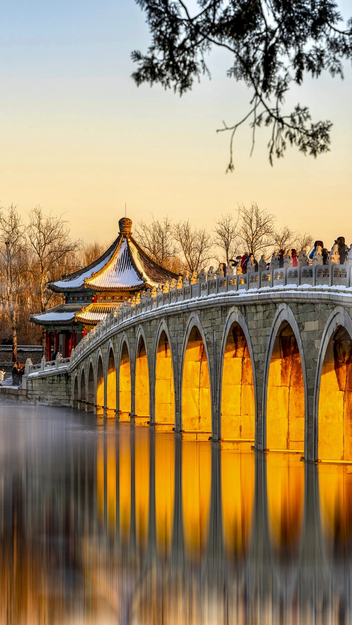十七孔桥的石拱被落日镀上金边,桥影与波光交叠,颐和园的黄昏,是刻在砖石里的浪漫。昆明湖畔,十七孔桥在暮色里舒展身姿,灯光与落日相融,桥洞的倒影在水中凝成金色的环,定格了颐和园的冬日温柔。