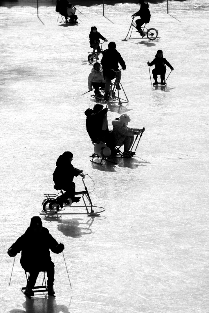 白是冰面的底色,黑是人群的轮廓。动静之间,冬日的浪漫与自由,都藏在这方冰场的光影里。 冰面的反光揉碎了暖阳, sled(冰车)划出的轨迹,是冬日最鲜活的注脚。人群错落成剪影,每一帧都是京城冰场独有的烟火气,把平凡的快乐刻进黑白光影里。