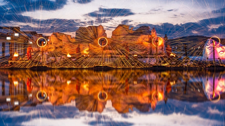 1张非遗绝技火壶表演 流光溢彩映夜空