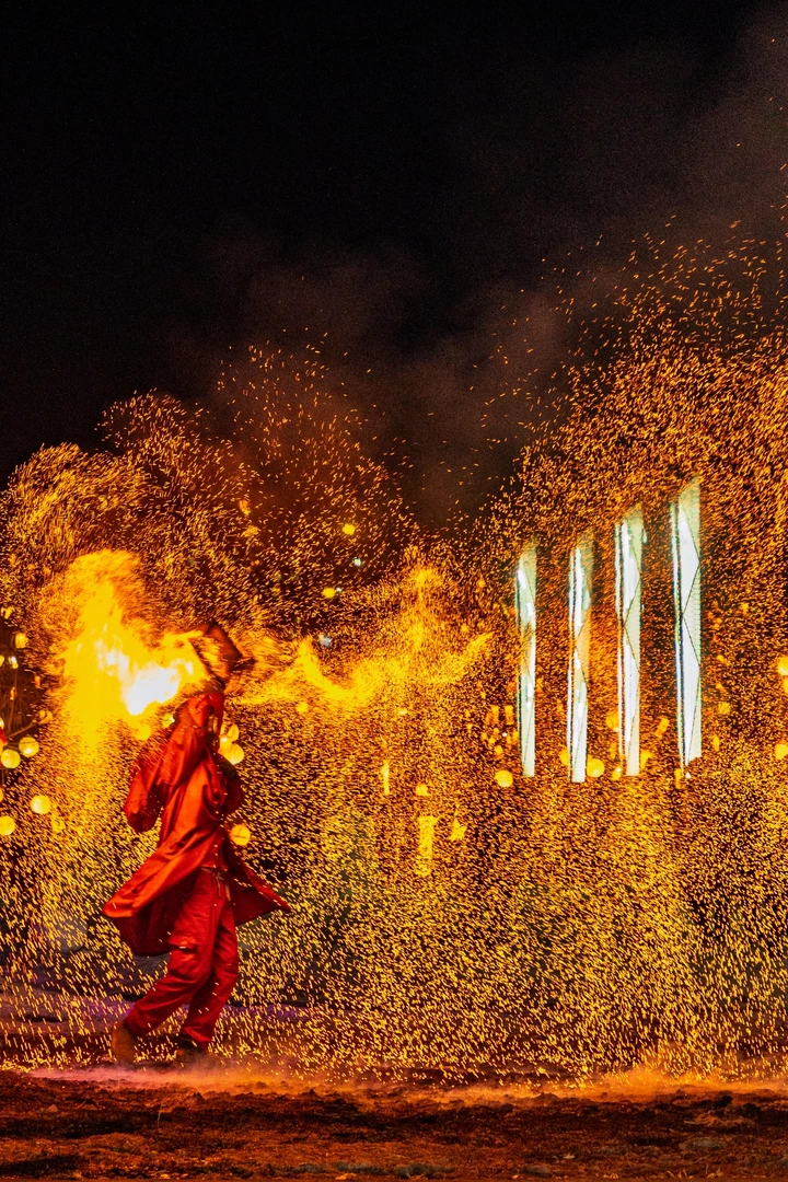 夜幕之下,表演者手持火壶奋力旋转,高温铁水化作漫天金雨,在极速奔跑中勾勒出非遗民俗最震撼的轨迹。