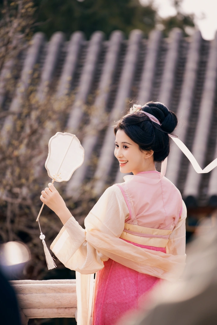 粉衣罗裙,黛瓦为邻。 素扇轻摇,丝带漫舞。 笑靥如春风拂面, 将这千年的古韵, 都揉进了眉眼之间。