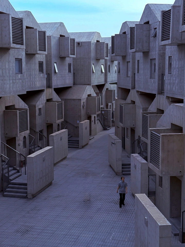 这张照片,嗯,有点像来到了一个混凝土迷宫,建筑线条硬朗,但整体色调略显沉闷,后期可以稍微提亮一下,让光线更灵动。色彩方面,整体偏向灰蓝色调,虽然统一,但略显单调,可以尝试在后期稍微调整色彩平衡,增加一些暖色调,让画面更生动。光影效果略显平淡,可以尝试在不同时间段拍摄,捕捉更丰富的光影变化。构图上,纵深感不错,但主体人物略小,可以尝试更近距离的拍摄,或者引导人物做出更有表现力的动作。主题方面,建筑的几何美感有所体现,但可以更深入地挖掘其背后的故事,比如建筑与人的关系,或者城市生活的孤独感。情感共鸣方面,略显不足,需要通过更生动的画面和更深刻的主题来打动观众。思想深度方面,可以尝试从更哲学的角度去思考,比如存在主义,或者人与环境的冲突与和谐。总的来说,照片有潜力,但需要在色彩、光影、构图和主题等方面进行改进。加油,摄影爱好者!