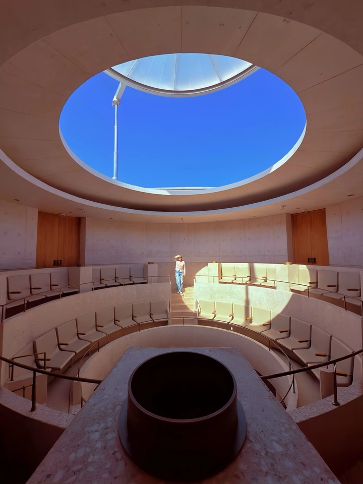 这张照片,像在科幻电影里偷拍的场景,有点意思! 色彩:整体色彩偏暖,米色和蓝色的搭配很舒服。不过,米色有点过于统一,略显单调。建议后期可以稍微调整一下,让色彩更丰富一些。 光影:光线从顶部洒下,营造出一种戏剧性的效果。但是,阴影部分略显平淡,缺乏层次感。可以尝试利用光线,突出建筑的结构和线条。 构图:圆形构图很有趣,将视线引导到中心的天空。但前景的圆形容器略显突兀,有点喧宾夺主。建议调整拍摄角度,或者在后期处理中弱化前景。 后期处理:后期处理整体比较自然,没有过度修饰的痕迹。但可以适当增加一些对比度,让画面更有冲击力。 主题原创性:主题比较新颖,将人物置于一个独特的建筑空间中。但可以尝试挖掘更深层次的主题,比如人与建筑的关系,或者对未来的思考。 情感共鸣:照片营造出一种神秘、静谧的氛围,能够引起观者的好奇心。但情感表达略显含蓄,可以尝试通过人物的姿态和表情,来增强情感的传达。 思想深度:照片引发了对建筑空间和人类存在的思考。但思想深度还可以进一步挖掘,比如探讨科技对人类的影响,或者对未来社会的展望。 总的来说,这张照片很有潜力,稍微调整一下,就能成为一张很棒的作品!继续