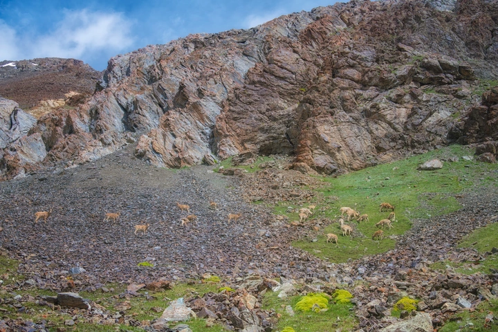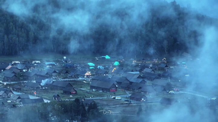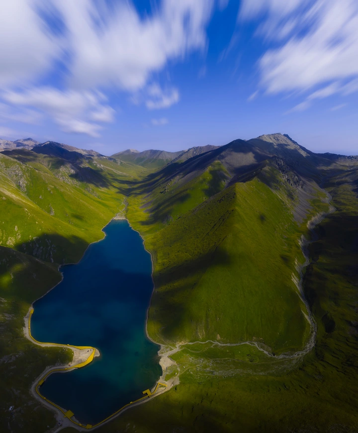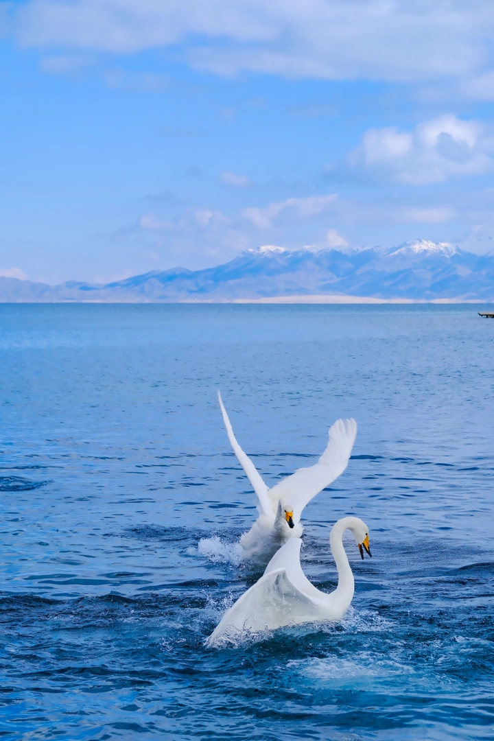 在帕米尔高原的白沙湖 太阳从昆仑山后面升起 朝霞浸染天空 湖中也泛起金色波纹