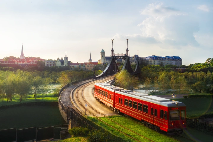 这列红色的快车,剪开了秋日温润的光线。轨道旁,浇灌出的绿意是季节最后的蓬勃,与远方城市的轮廓,共同构成一幅关于收获与希望的画卷。我们都在车上,奔赴一场名为未来的金黄邀约。