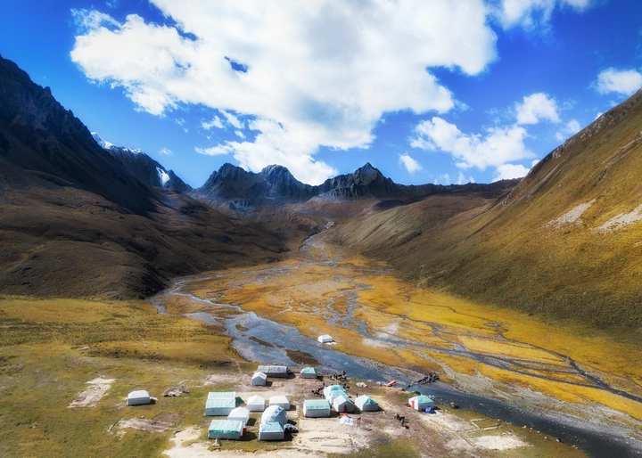 皑皑雪峰托起湛蓝的天幕,如天神遗落的银冠守护着这片秘境。蜿蜒的溪流似一条透亮绸带,穿过度过盛夏已泛微黄的草甸,将散落的白色帐篷轻柔串联。帐篷如蒲公英种子般栖息河岸,静默聆听着千年冰川融水的浅唱。远山裹着斑驳雪痕,与空中游走的云影交织成朦胧的诗行。这里,风拂草浪是唯一的喧嚣,光阴在雪水沁润的泥土中缓慢生长,仿佛天地初开时,宁静最初的模样。