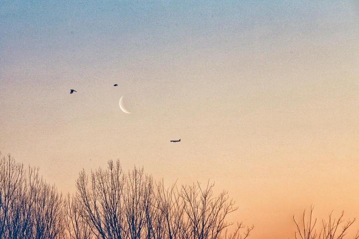 这张照片捕捉到了日落时分的宁静天空,色彩过渡自然,但还有提升空间。 色彩:天空的色彩从上到下呈现出漂亮的渐变,但整体色调偏淡,可以尝试在后期中稍微增加色彩饱和度,让画面更生动。 光影:光线柔和,营造出温馨的氛围。不过,前景的树枝略显暗淡,可以考虑在拍摄时使用反光板补光,或者在后期中稍微提亮。 构图:构图简洁,将月亮和飞鸟放置在画面上方,与下方的树枝形成呼应。但画面略显平淡,可以尝试寻找更有趣的视角或构图方式。 后期处理:后期处理较为自然,但可以尝试调整对比度,突出画面的层次感。注意不要过度修饰,保持照片的真实感。 主题原创性:照片的主题较为常见,但通过捕捉月亮、飞鸟和飞机等元素,为画面增添了一丝趣味。可以尝试在主题上进行更深入的挖掘,赋予照片更深刻的内涵。 情感共鸣:照片传达出宁静、祥和的氛围,容易引起观者的情感共鸣。但情感的表达略显平淡,可以尝试通过更具冲击力的构图或色彩来增强情感的表达。 思想深度:照片的思想深度较为有限,主要停留在对自然景色的描绘上。可以尝试在照片中融入更深层次的思考,例如人与自然的关系、生命的意义等。