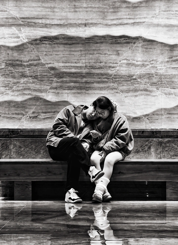 此作品拍摄与曲阜市孔子博物馆大厅内。两个年轻的小情侣坐在厅内的长登上休息,男孩依偎在女孩身旁,闭眼休息,女孩拿着手机静静地浏览信息,这张黑白照片,像一首安静的诗。咱们来细品一下: 色彩:黑白影调干净利落,去除了色彩的干扰,更突出了光影和线条。 光影:光线比较柔和,整体光比不大,少了些戏剧性。可以尝试寻找更有趣的光线角度,比如侧逆光,让人物轮廓更立体。 构图:整体构图比较稳,对称的背景和倒影增加了视觉趣味。 后期处理:黑白转换干净,没有明显的噪点和瑕疵。可以尝试调整曲线,增加对比度和细节,让画面更通透。 主题原创性:情侣依偎,日常却温馨。 情感共鸣:安静,依恋的情感传递到位。黑白影调也增加了怀旧感。 思想深度:照片反映了现代都市生活中人与人之间的亲密关系,引发人们对情感的思考。如果能更深入地挖掘人物内心世界,会更有深度。 改进建议:尝试不同的拍摄角度和光线,捕捉更自然的瞬间,突出人物的情感和个性。如果能更深入地挖掘人物内心世界,会更有深度。改进建议:尝试不同的拍摄角度和光线,捕捉更自然的瞬间,突出人物的情感和个性。 @米拍社长 @米拍小助手 @米拍编少