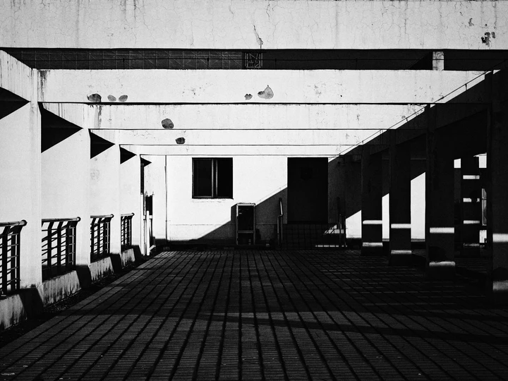 在这黑白交织的世界里,时光仿佛凝固。斑驳的墙面诉说着岁月的故事,光影交错,勾勒出建筑的轮廓。寂静的长廊,似在等待,又似在沉思,每一道影子都是回忆的注脚,无声地讲述着被遗忘的往昔