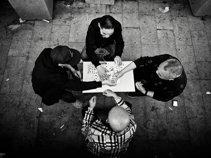 在城市的一隅,一方小桌成为了时光的舞台。四位老友围坐,专注于手中的纸牌。没有喧嚣,只有默契的眼神与思索的神情。黑白的画面,似是将这份质朴的情谊凝于永恒,那是平凡日子里,独属于他们的悠然时光