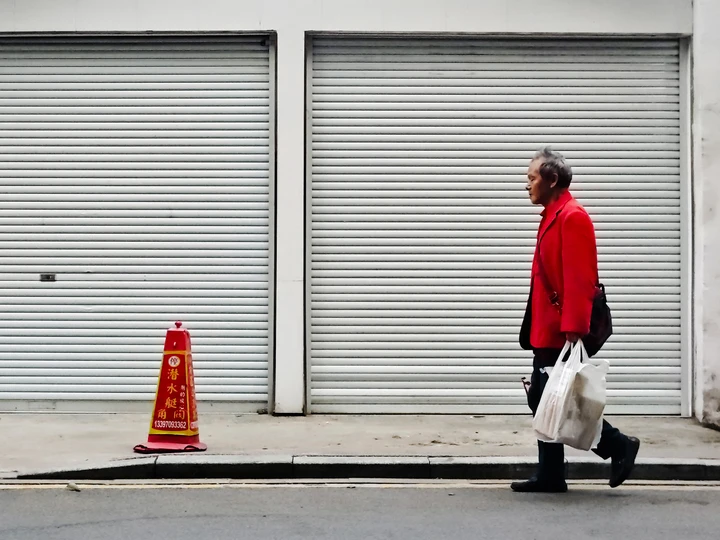 在城市寂静的角落,老人身着鲜艳红衣独自走过紧闭的卷帘门前。手中的塑料袋装着生活的琐碎,身旁的交通锥似是无声的陪伴者。此刻,时光仿佛慢了下来,每一步都是岁月的沉淀,每一处景象都诉说着平凡日子里的故事,在喧嚣中寻得一方宁静,于平凡中感受生活的质朴与深沉