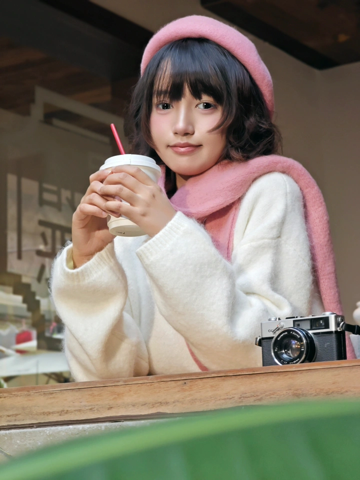在温暖的小店角落,邂逅一份独属于自己的宁静。头戴温柔粉帽,身披同色围巾,手捧香浓热饮,丝丝甜意顺着吸管流淌进心间。身旁复古相机静静伫立,仿佛随时准备定格这悠然一刻。岁月悠悠,慢享这一份惬意的小美好