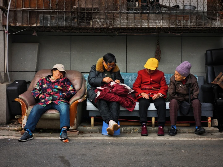 在城市的一角,时光仿佛放慢了脚步。几位老人悠闲地聚在一起,有的闭目养神,在宁静中回味往昔;有的专注于手中针线,缝补着生活的温暖;还有的静静坐着,沉浸在自己的思绪里。他们身上的衣物色彩斑斓,如同他们丰富的人生。老旧的沙发、斑驳的墙面,构成了这充满烟火气的场景。这里没有喧嚣,只有岁月沉淀后的静谧与淡然,每一道皱纹都藏着故事,每一个神态都是生活的诗篇