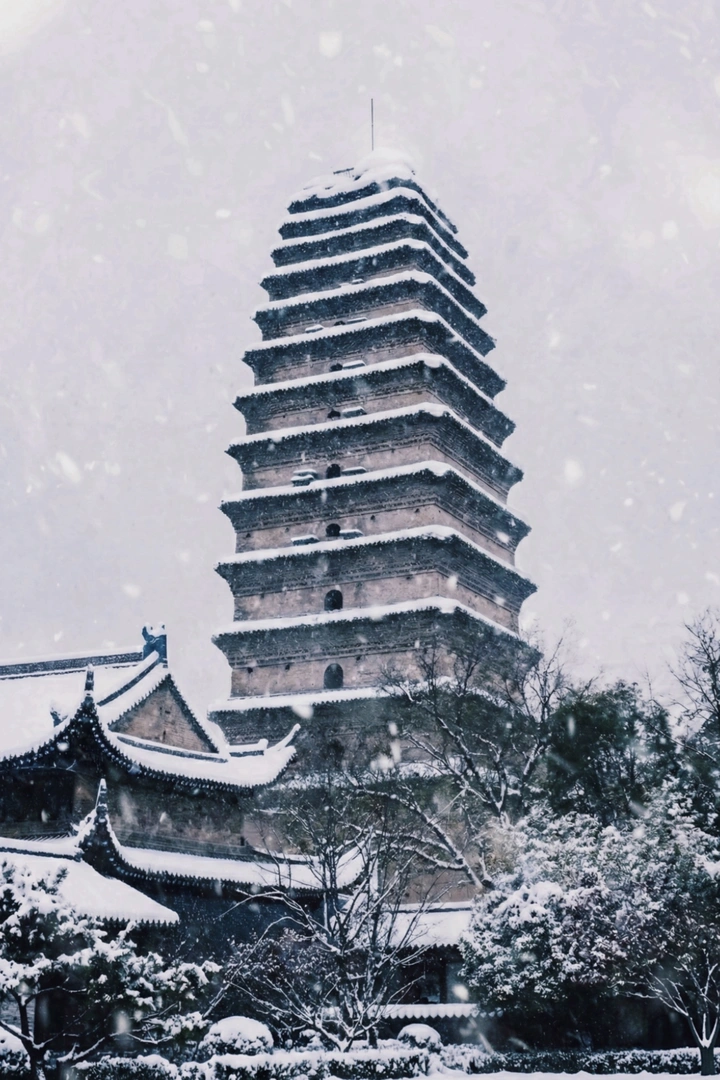 西安小雁塔在飘雪中愈发静谧,千年砖塔被薄雪轻覆,如时光落在古城的肩头。檐角滴落的雪水与远处的钟声相和,仿佛将冬日的寒意与历史的温度交织在一起,温柔又庄重。