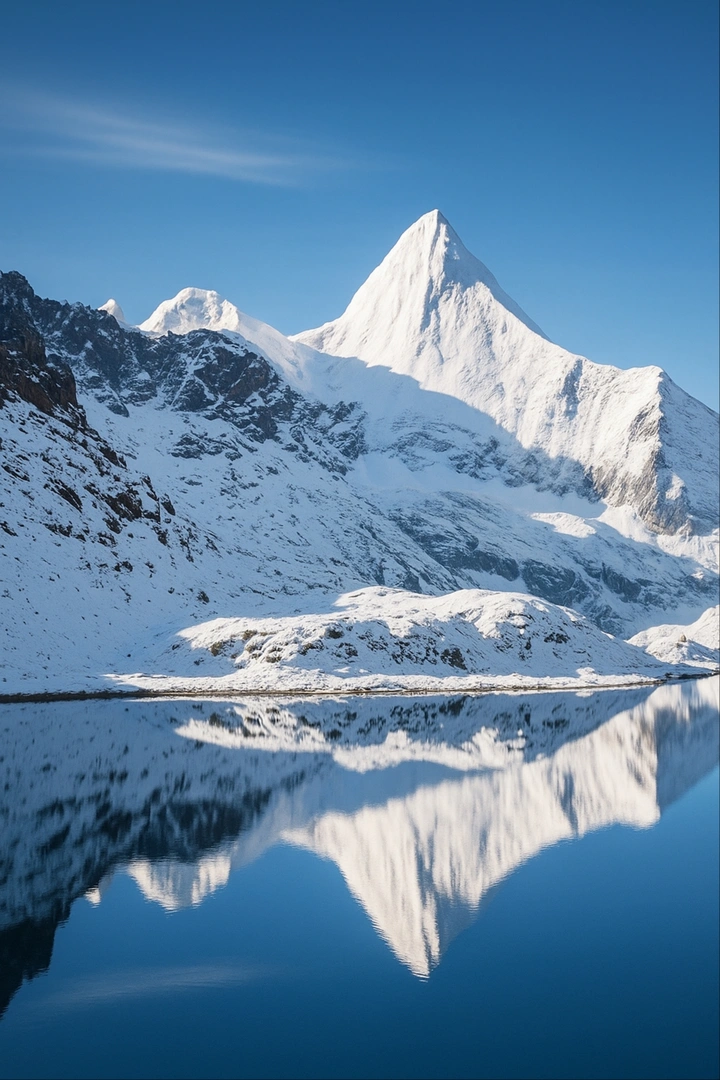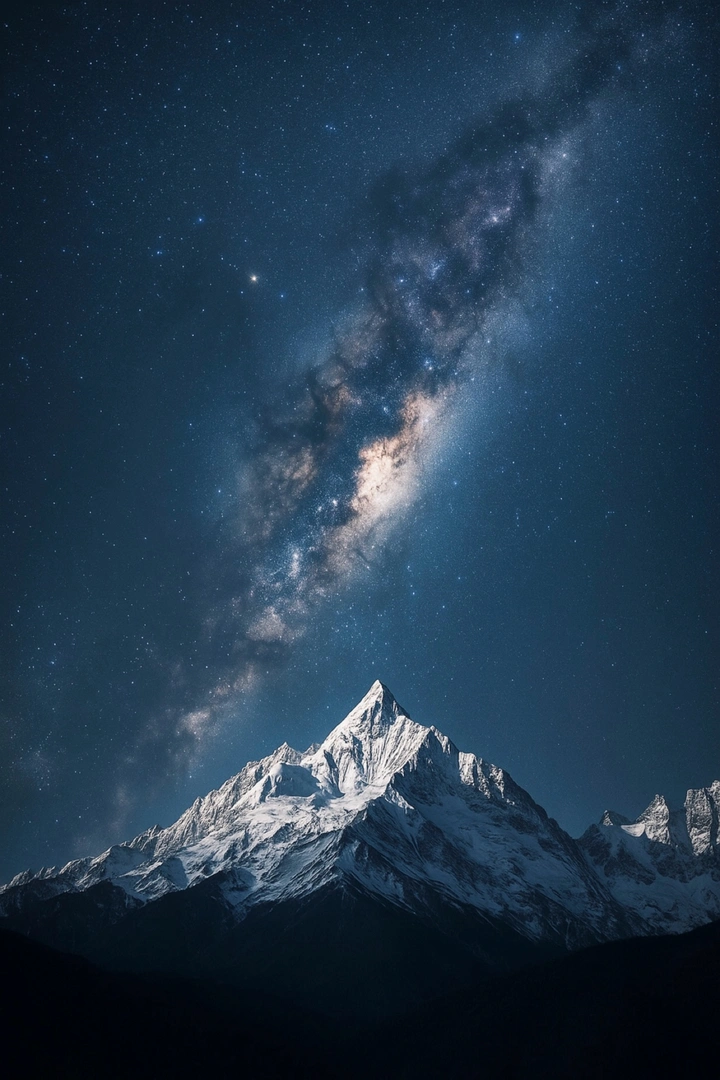 繁星点点,银河如诗,将浩瀚宇宙的神秘展现无遗。下方雪山巍峨,冰雪皑皑,与星光交相辉映,构成一幅令人屏息的自然史诗。画面通透纯净,细节丰富,充满张力,仿佛置身于天地间的绝美梦境。