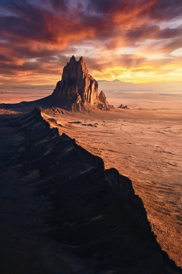 船形岩位于新墨西哥州圣胡安县纳瓦霍族保留地 (Navajo Nation) 内。这是一座拔地而起约482米高的火山颈(Volcanic neck/plug)是远古火山喷发后遗留下来的熔岩核心。 落日将荒原染成金红,船形岩的轮廓在余晖中愈发孤绝。它矗立在新墨西哥的寂静与风声里,如远古熔岩凝成的守望者,经历千万年的日升月落仍不曾改变。