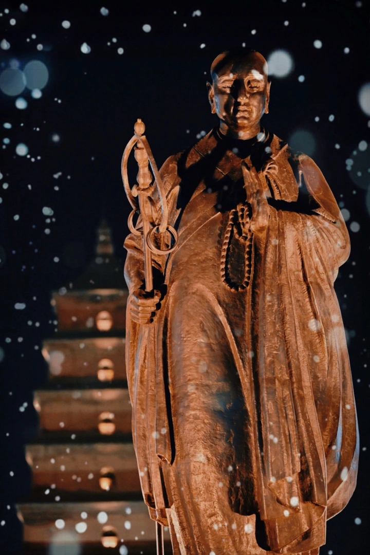 夜雪轻落,大唐不夜城灯火如昼。炫装雕像肃立其间,手持锡杖,目光沉静。身后,大雁塔在光影中层层递进,古意与霓虹交织。风过长安,千年文明在此刻凝固,静谧而庄严,仿佛历史正与今夜对话。(最近拍不了照片,发一些老照片)