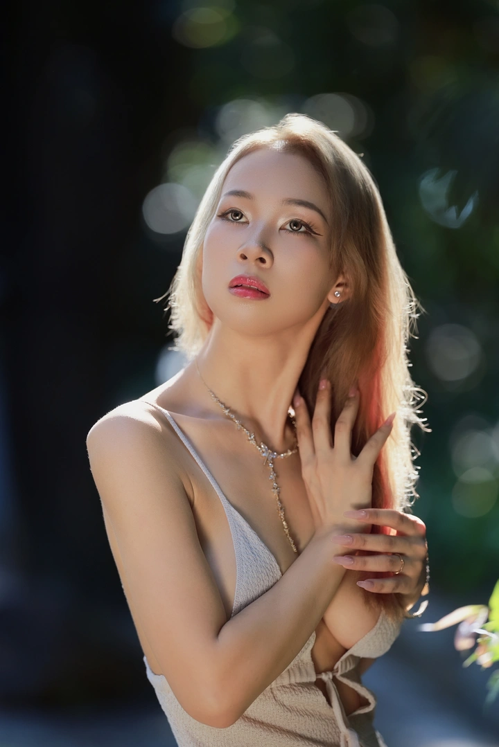 穿行在枝叶交错的林间,阳光透过缝隙洒在肩头,风携着草木的清香掠过裙摆,她就像从自然里生长出来的缪斯,每一个驻足的瞬间,都让森林的静谧与艺术的灵动,在光影里凝成了一首温柔的诗。