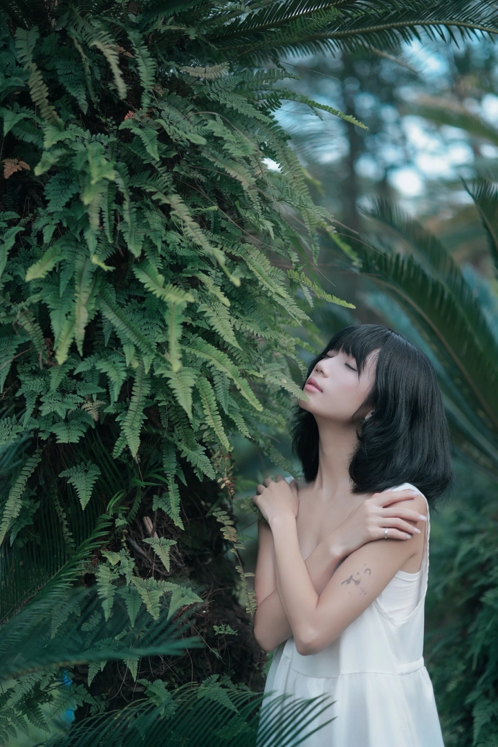蕨叶簌簌,似在低语森林的秘密;白裙翩跹,少女在绿意织就的梦境里,与每一缕草木的呼吸共鸣,听风掠过叶隙的声响,把时光酿成了绿野间的诗。