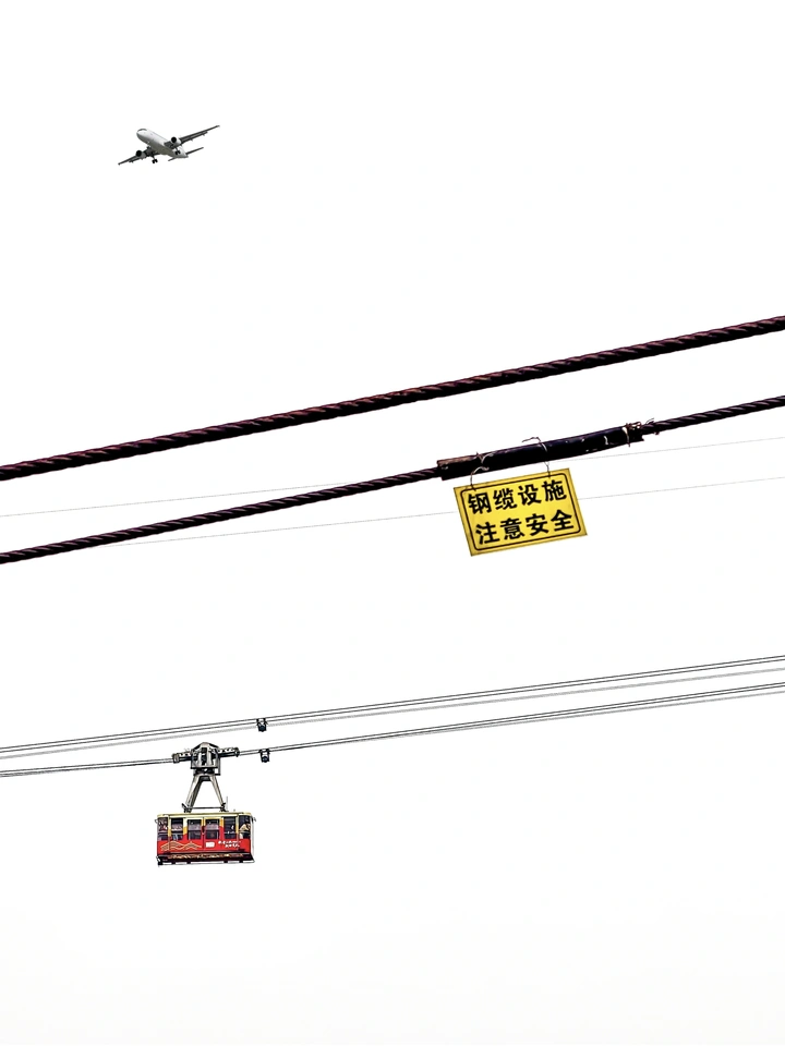 钢缆在纯白的天幕上拉成利落的线条 黄底黑字的警示牌悬在其间 是山城独有的安全注脚 红色缆车顺着钢索缓缓滑行 像一枚跳动的火种 在纵横的线缆间穿梭出属于重庆的韵律