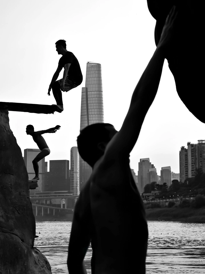于高台之上,年少的轮廓化作跃动的剪影,向着江水纵身一跃。每一次起跳,都是对自由的追逐,对自我的突破。城市的天际线静静守望,见证着这无畏的身姿。青春本就是一场大胆的冒险,我们以跃起的身姿,书写独属于自己的故事,跨越界限,向着光亮与未知,勇敢奔赴 。