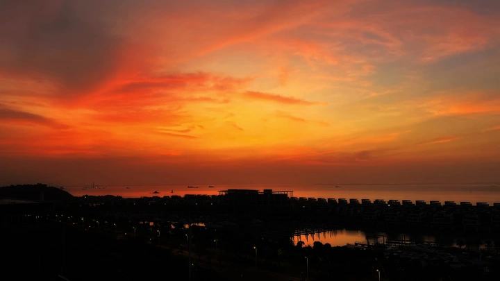 火烧云在天际铺展开,将海面染成流动的金。 桥影与远山在暮色中安静矗立,海风轻拂, 把一天的喧嚣都收进温柔的黄昏里。