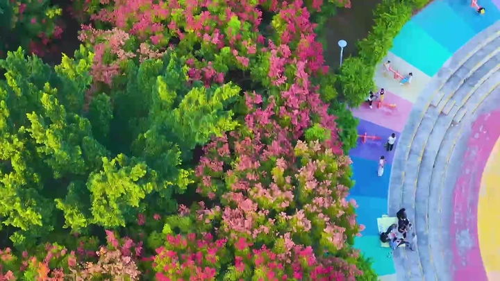初秋星湖公园,彩虹童趣乐园遇绯红栾树,澄澈湖水映葱郁绚烂,成城市梦幻一角。大人享悠然,孩子得欢喜,每处色彩、每缕花香,皆诉自然生活温柔诗行。