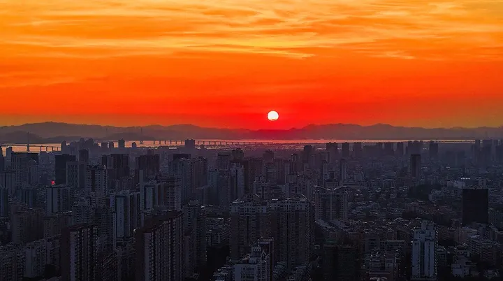 当夕阳将天空晕染成炽热的橙红,城市的楼宇在余晖中勾勒出冷峻的轮廓。远处的桥梁与山峦在暮色里若隐若现,这一刻,喧嚣的都市与温柔的晚霞撞了个满怀,时光仿佛也在此刻放慢了脚步。