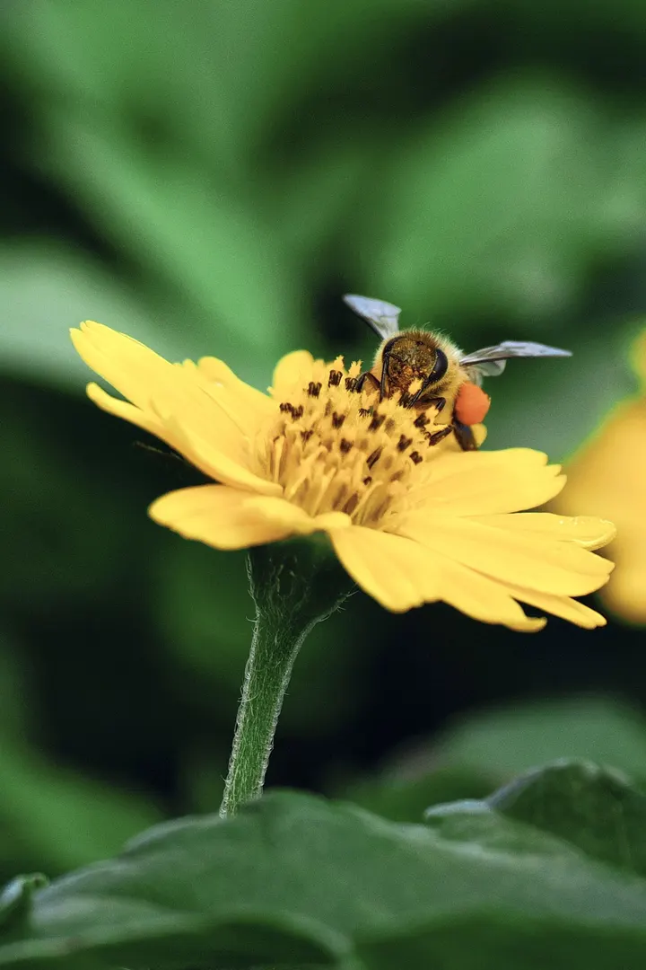光里,蜜蜂把自己化作灵动的音符,在黄色花盘上奏响采蜜的乐章。它穿梭于花蕊间,将秋日的甜意一点点收藏,每一次振翅,都是对季节馈赠的温柔回应。